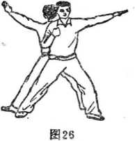 甲、乙二人均向前上左步,穿左掌,双方后背聒身擦过 (图26)。