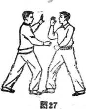 甲左手掌往上往右拍开乙右手,掌心朝外,置于右脸侧。 同时右手俯掌往下砍切乙右腰胯(图27)。