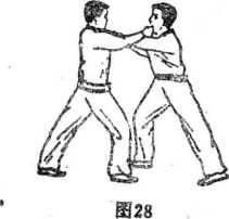 乙左手由下穿进甲右臂内,上挑往左,切住甲右臂部。 同时右手仰掌,以虎口卡住甲喉部(图28)。