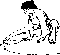 扫转性腿法。上身前俯,两手 推地。支撑腿(一般为左腿)全蹲作轴;另一腿(右腿)伸直,脚尖内扣,脚掌擦地,顺时针迅速 后扫一周。 (李小杰)