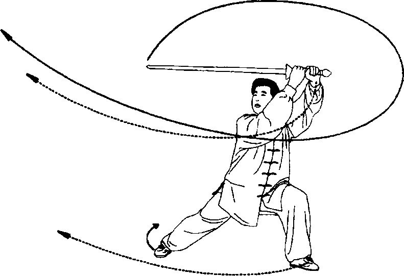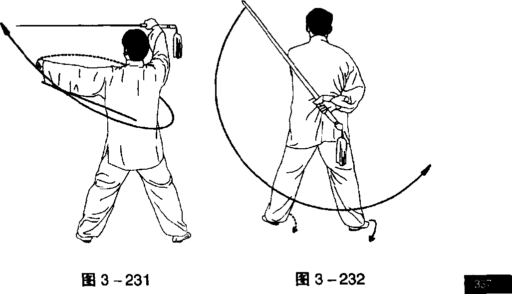 ① 身体上起仰头,以右脚跟为轴,脚尖外展,向右转体,随之 左脚向前上步;同时右手持剑,扣腕臂内旋,使剑随转体在面上 平云一周,右手心向下,剑身平置,剑尖向左前方;左剑指随转体 摆于身体左侧,左臂微屈,左手拇指一侧向下。目视剑身(图3- 231)。