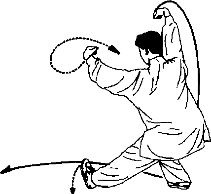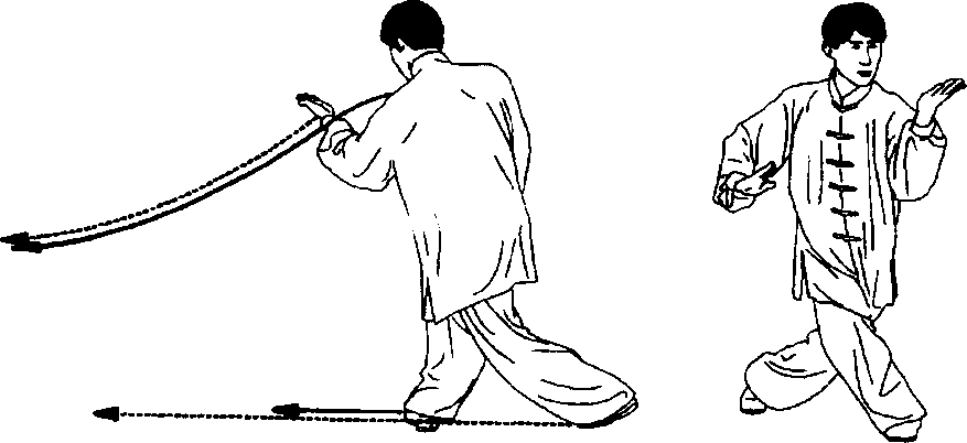 ①重心前移,身体微 左转再右转,右脚经左腿 前向左盖步,右脚尖外 撇;同时左臂外旋,左勾 手变掌,向下、向右掩肘 摆于身前,掌心向上;右 勾手变掌,向右、向下摆 于身体右侧,掌心斜向 下,掌指斜向上。目视两