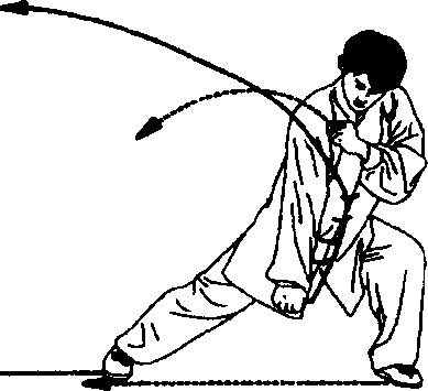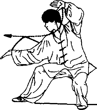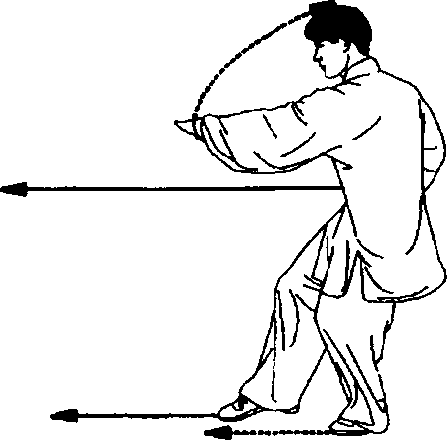 ① 身体微右转,左脚向右脚跟步,随之重心移于左腿,左腿屈 膝微蹲,右脚跟抬起;同时右拳屈肘收抱于右腰侧,拳心向上,左