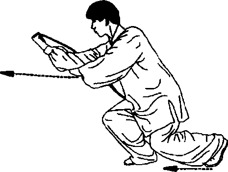 图 2-112图 2-112掌横掌顺右前臂下 前移,掌心向下,高 与胸平。目视左掌 (图