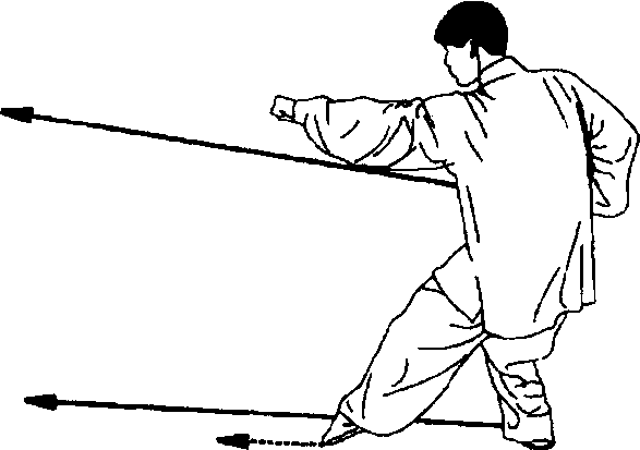 左脚踏实,身体左 转,右脚向前跨步,随 之左脚向前拖步跟进 成左戳脚步;同时右拳 由腰侧向前冲出,拳眼 向下,高与鼻平;左拳 收于右肩前,拳眼向 后。目视右拳(图2-