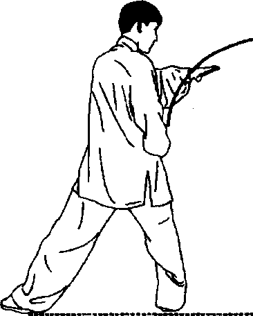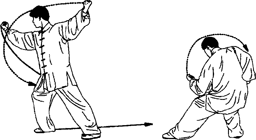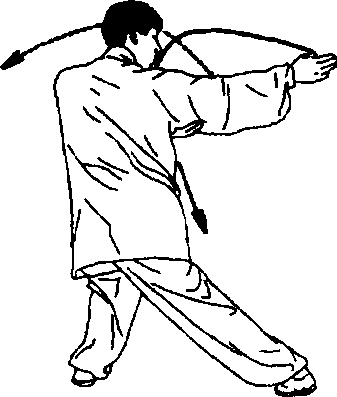 步,左脚跟抬起;同时右拳变掌, 向上经左前臂上向右反击掌于 体右侧,拇指一侧向上,高与肩 平;左掌收于右腋下,掌心向下。