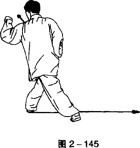 ① 身体起 立,向右转体; 同时左拳变掌, 向上、向右、向 下按掌于右肩 前,掌心向下, 高与胸平。目视 左掌(图2- 143) □