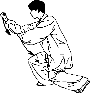 ④ 踣踣两腿下蹲成马步;同时两 掌变拳,两肘向两侧顶出,两肘 高与肩平。目视左侧(图2-