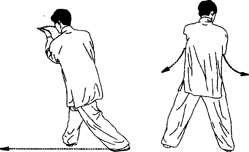 ③ 右脚向 前跨步,左脚 随之向前拖步 跟进成左戳 脚步;同时左 掌经右前臂上