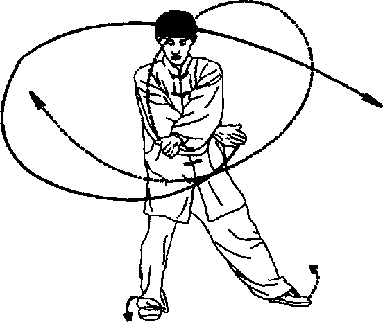 ② 身体左转,左脚尖 和右脚跟外展;同时左掌 向上、向左、向下、向后抡 摆于身体左侧,掌心斜向 前;右掌向下、向右、向上、