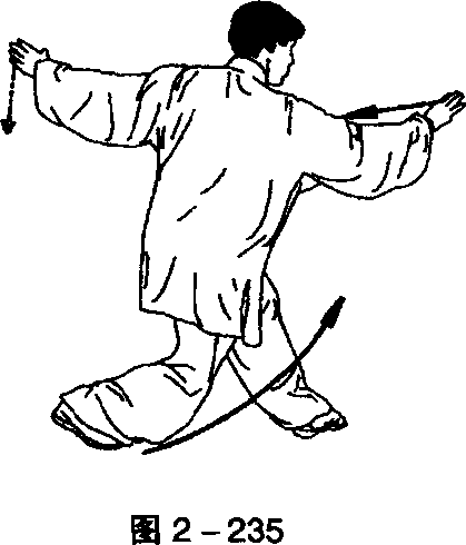 ① 左脚在身体左侧精 步;同时两臂体前交叉,左 臂在外,两掌心斜向外下 方。目视左掌(图2- 234)。