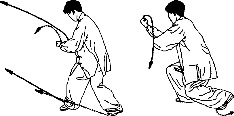 ② 身体右转,重心右移变右 弓步;同时左掌由肩前向前下
