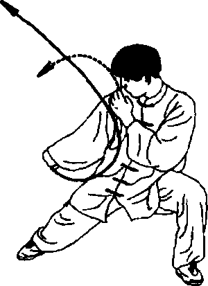 ① 身体左转,重心左移成左 弓步;同时右臂内旋,伸直于身体 右侧,拳心向后;左掌按于右肩 前,掌心向里,掌指斜向上。目视 右侧方(图2-318)。