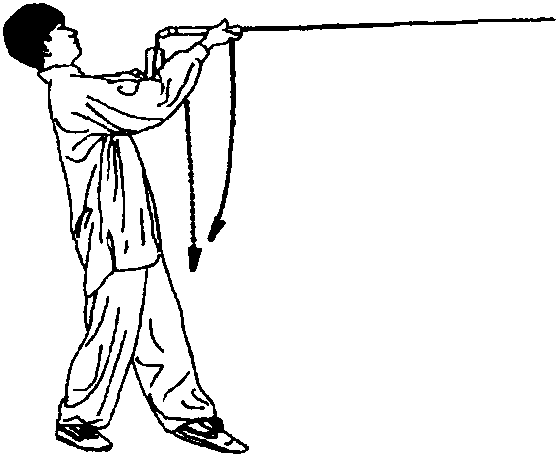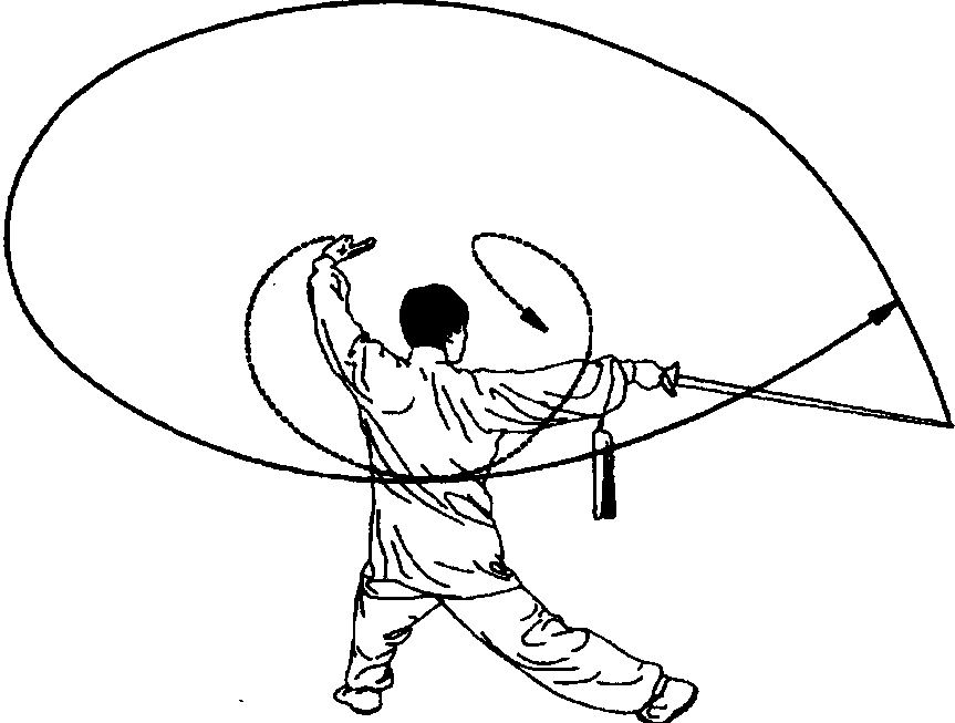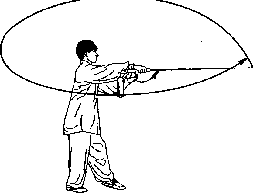 下;右臂内旋再 外旋,右手持剑, 用小指一侧剑刃 向左、向后、向右、 向前在面上平云 一周,右手心向 上,剑尖向前,高 与鼻平。目视剑尖 (图 3-23)。
