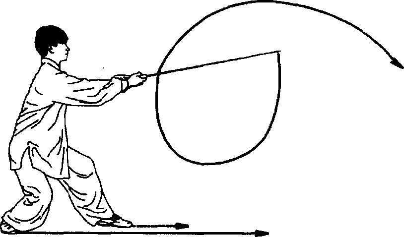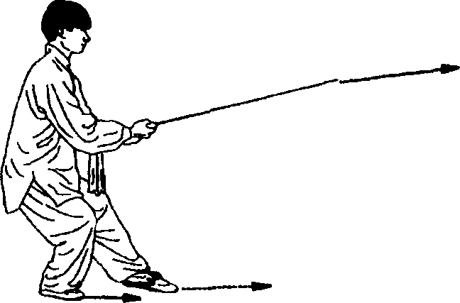 冒 同时右手持剑,向前刺出,右手心向上,剑身平置,高与胸平;左
