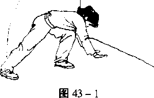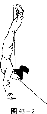 两手向前下落地支撑与肩同宽。目视地面(图43-1)。两手撑地 不动。右脚蹬地上摆靠墙(或肋木),绷脚面,左腿伸直协同上摆, 两脚并拢。挺胸、仰头,目视地面(图43-2)。