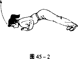 ② 铁牛耕地:身体俯卧。两脚并拢,脚跟提起,前脚掌撑地。 两手臂撑地略宽于肩,两掌指尖向前。臀部高提,目视地面(图 45 - 1)。接上动,两臂屈肘,头由后向前,俯地向前伸探,重心前 移,臀部下移(图45-2)。上动不停。上体呈波浪状向上抬起, 头后仰。塌腰、沉臀。两臂直撑。目视前方(图45-3)。