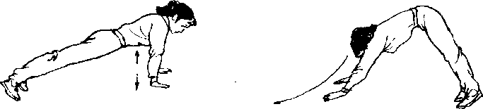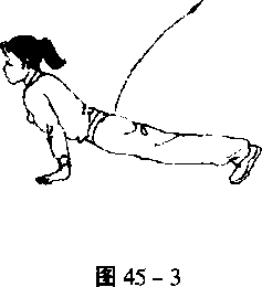 ① 俯卧撑:身体平俯于平面。两脚并拢,两臂伸直,两手掌撑 地同肩宽,两臂上下推撑,身体伸直(图44)。
