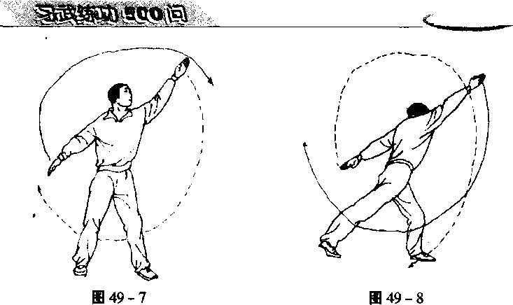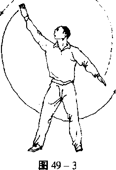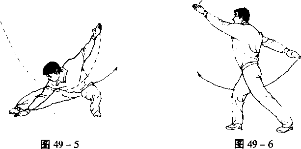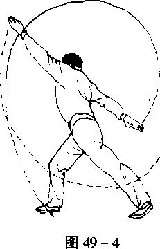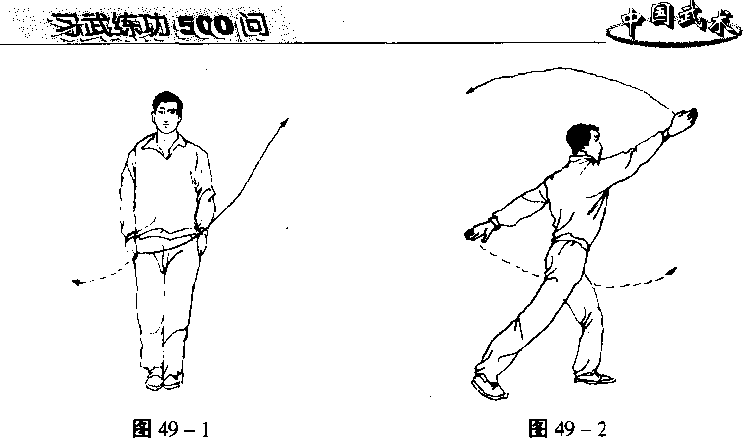 (图49-3)。②上动不停,身体右转90度,右腿前弓,左腿伸直, 脚跟提起;同时,右手向下、向后弧形抡摆,左手向上、向前弧形 摆抡;眼看右手(图49-4)。