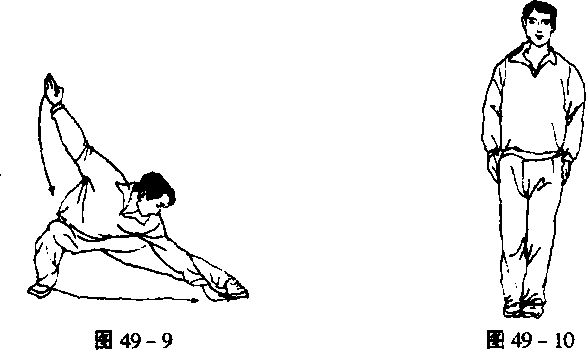 收势:重心左移,右脚蹬地收回成并步立正?,眼向前平视(图 49-10)。