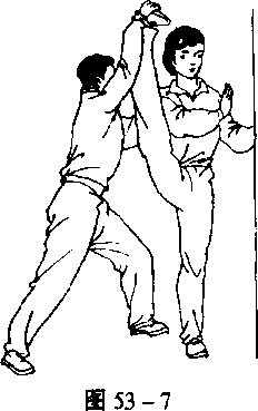 除本人压耗腿外,还可借助外力做相应练习。如:练习者手扶 物体一腿直立支撑,另一腿由同伴一手扶握膝关节,另一手托住脚 跟向体测上方搬压,其力量大小和高度要因人而宜,由低到高,力 量逐渐加大,也可上下振压搬腿,切不可操之过急而造成肌肉韧带 拉伤或影响动作的正确动力定型(图53-.7)。