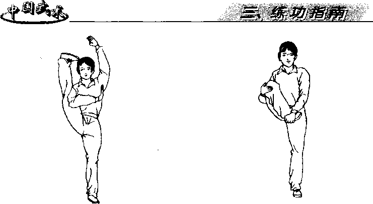 压、搬腿之后应做踢腿练习,通过压踢结合的方法,有利于较 快提高腿部柔韧性和灵敏、控制力量等素质。在做侧踢时,应注意 开髋,左腿脚尖向前或稍外展,上体成侧身,右腿沿肩后向上踢 起,左臂上摆,肩放松(图53-8、9)。