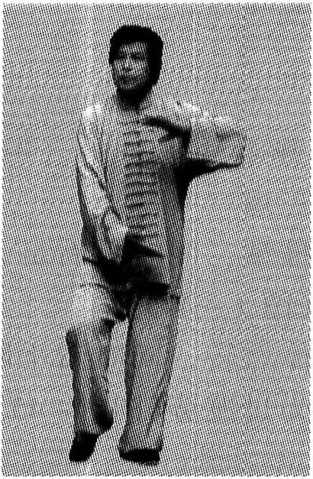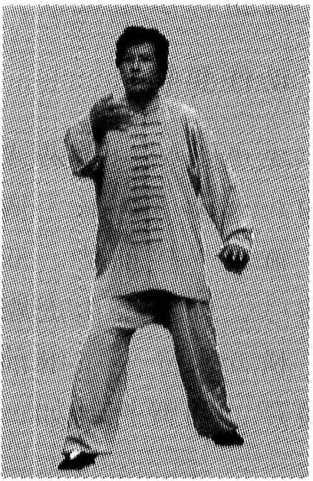 左手做搭手状,同时右手回坐腕,顺身左侧捋开。 这个动势的身姿改换,是由前动作棚而呈“龙”姿,继 而“龙”姿转化为“虎”势的动作(图1-49)。
