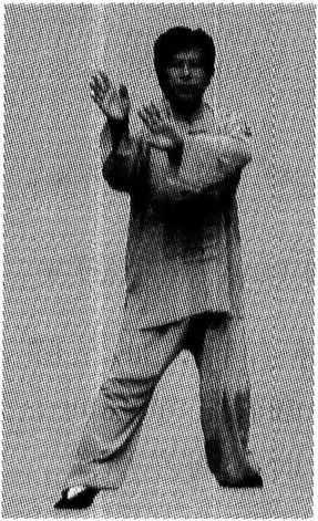 右横金肘抱球圆。 左掌前棚正当先。 回身挤手龙在前。 龙行虎按神气全。 左峙虎势球左悬。 右棚左捋虎左还。