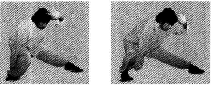 两脚不动;右手顺背右侧腰际处贴身推下,过臀部 经大腿的后侧向下导引,同时身形顺势蹲身(图3 _ 8)。