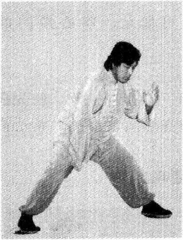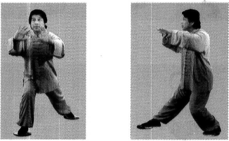 双掌外翻,掌心向前;重心前移,两掌向前推出, 五指渐分呈爪形。两臂两腿弯曲;身形前移,重心移至 右腿,右腿呈弓步,左腿渐伸直;同时两臂向前推出, 呈伸展状,曲中求直,切不可僵化。掌心微向前凸 “吐”(图 3-15)。