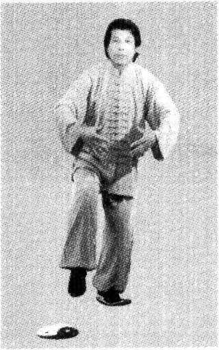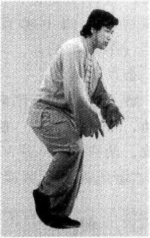身形前移并站起,重心移向左腿,右腿慢慢向前提 起;同时两手分别由上至下向身前小腹丹田处移动,右 手沿左腿内侧由腹股沟处抬起,左手下滑(图3-11)。