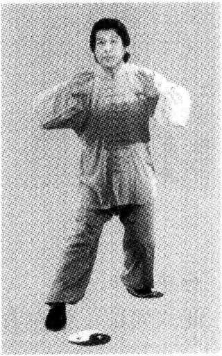图 3- 11图 3 - 12图 3 - 13图 3 - 14手脚同时动作,右脚轻徐落地;两手坐展双腕,掌 心虚守,手如浮球状(图3- 14)。