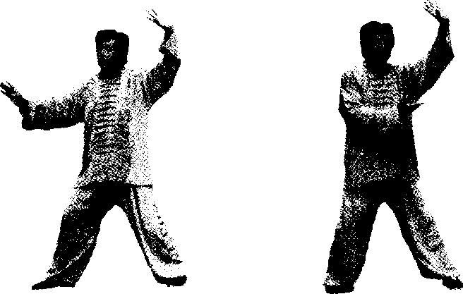 继前动作如(图9-身体右转,右手由横手向右侧扬 起,手心向上,同时左手下落。此为【右遮云避日】。