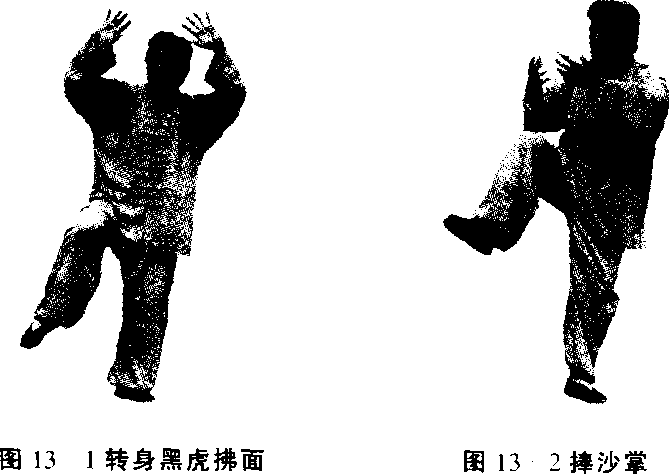 图13-3左右双封太子掌图13-3左右双封太子掌接前势如(图13 - 1)。身体右 转,双手向外向上划圆至头部,掌 心向上,呈捧沙掌势,同时将右脚 提起呈凤点头势。此为【转身黑虎 拂面】。
