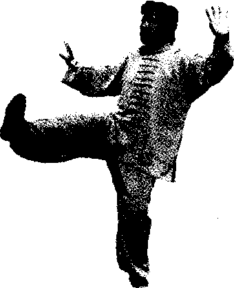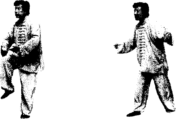 继前动作如(图13 -2)。双手 翻腕下落至胸前,同时将右腿提高 做欲蹬状。此为【捧沙掌】,又为 【太乙双封里合手】、【分明玉镜照故 人】。