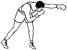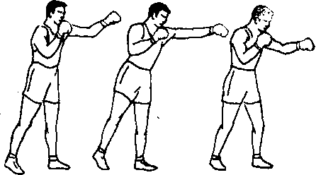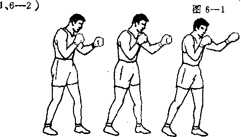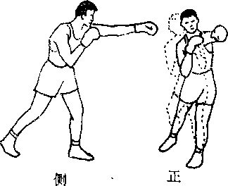 动作:从基本搏斗姿势开 始,重心移至左脚?左脚微向 里扣,脚跟微外转,左膝屈成 110。一 120°。重心向右脚移 动。右脚蹬地,身体随之右转。 同时左臂沿直线快速冲出。右