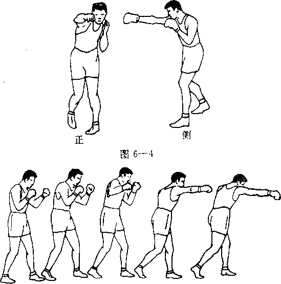 动作:从基本搏斗姿势开始,以右前脚掌支撑蹬地,同 时脚跟外转,把蹬地力量传至全身。身体随左后转,旋右臂 向前沿直线冲出,在接近目标刹那合肩,将拳握紧。随出拳 瞬间,重心移在左脚上,全脚着地。右脚微向左脚踵跟进, 右膝靠近左膝。收左手防护头及上体。(图6—4、6—5)