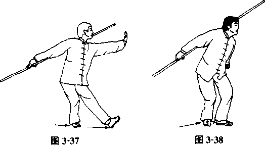 (3)右手握棍,小臂外旋,翻转手腕,将棍背于背后;左手 配合动作自然摆动(图3-37、图3-38)□
