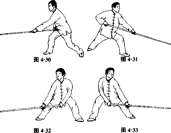 5.斜劈棍两手握棍,一手握棍的中 段,滑向另一握棍把段的手, 两虎口朝棍梢方向。使棍由 斜上方向斜下方劈,动作要 快,力达棍端。身体与棍法配 合要协调(图4-37、图4-38)。5.斜劈棍两手握棍,一手握棍的中 段,滑向另一握棍把段的手, 两虎口朝棍梢方向。使棍由 斜上方向斜下方劈,动作要 快,力达棍端。身体与棍法配 合要协调(图4-37、图4-38)。