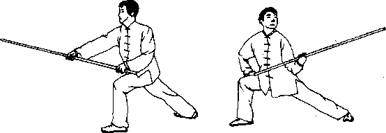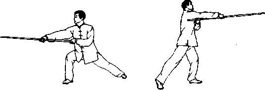 两手握棍,一手握棍的中 段,滑向另一握棍把段的手, 两虎口朝棍梢方向。使棍由 斜上方向斜下方劈,动作要 快,力达棍端。身体与棍法配 合要协调(图4-37、图4-38)。
