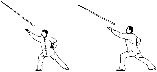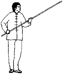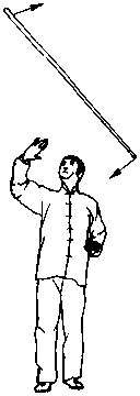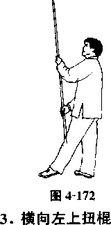 两手正握棍;左手握棍中段,手心朝下;右手握棍把段,手心 朝上。左小臂外旋,使手心翻向上;右小臂内旋,使手心翻向下向 外扭棍,边扭边向右侧上划弧,力达棍梢段(图4 173)。