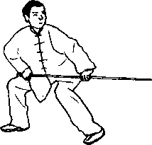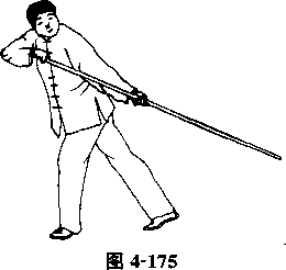 两手正握棍,左手握棍中段,右手 握棍把段,手心朝里。两肘弯曲,手臂 内旋,使手心经下翻向内,边翻手左手 边下压内拉,右手边向左前上推,用力 扭棍,力达棍梢段(图4-174)。