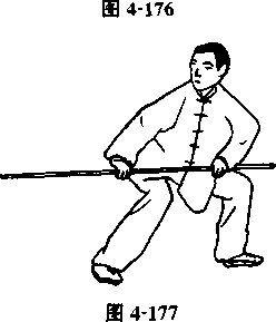 两手对握棍,虎口相对;左手握棍中段,手心朝内下方;右 手握棍把段,手心朝内下方。使手心经下方翻向前上方,两臂 屈肘;边翻左手边向左胸前拉,右手向前左下推,用力扭棍, 力达棍梢段(图4-176)。