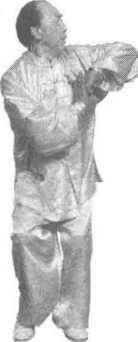 2. 上身以腰椎为轴转动,带动两手向左右后方抖动三次,随即内旋,使其 手心朝下,再以爆发劲外旋,向左右两侧甩出,手心仍向上。眼视正前方(图 139),定式仍如图139。