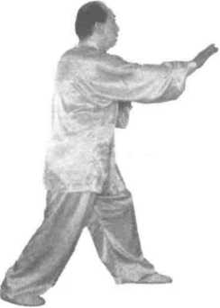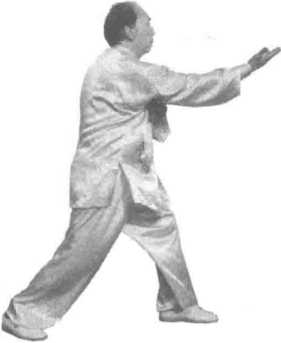 再往右划弧,在右手向前穿掌时停于右肘下,掌心朝下。随之,身体重心移在 右腿上,左脚向左前方上步,重心前移成左弓步。眼视右掌(图141、图142)。