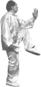 5. 右金鸡独立:身体重心前移,右腿独立,左腿屈膝上提,脚面伸直,脚 尖朝下。同时,右手经前上挑再收于腹前;左手手指松开,由左后、经下、向 前上方划弧,屈肘收于身前,手指向上,手心向右,高与眼平。眼视左掌前方 (图 149)。
