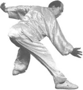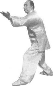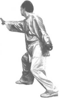 5. 图158图158白蛇吐信:身体重心居中,身微 左旋。右手以指领劲,自右上、经中 而下划弧至腹前;左手自左后而上、