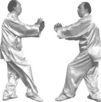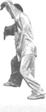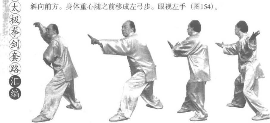 胃)向额前上方划弧(图153)。接着,两手变剑指,右手在额前上方经中而下、往 右下方划弧,剑指朝右后下方;同时,左手剑指领劲,向左前上方戳出,剑指