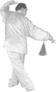 1.左脚向右腿后倒插一步,脚尖点地,脚跟提起,两腿微屈成叉步。同时,