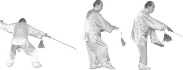 图89图89图90图90图88图88左脚向左侧跨步,两腿屈膝略蹲成马步。同时,右手持剑以肘、腕为轴, 剑从下向上、再向左侧绕一小弧,然后反腕向右下方崩击。左臂在剑绕弧的同 时,从上向右、向下、再向左侧伸展(图88)。图89图89图90图90图88图88